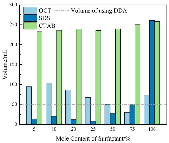 Figure 5 shows that when the concentrations are all 1 × 10−3 mol/L, the foaming properties of the three surfactants are more potent than those of DDA. Among them, the foaming properties of OCT and DDA are similar and much weaker than those of SDS and CTAB. However, due to the limitations of the dynamic foam analyzer range (260 mL), the experiment automatically stops when the generated foam reaches the overflow warning line, so it is currently impossible to determine the relative foaming properties of SDS and CTAB at the current concentrations. The interaction between the three surfactants and DDA has a significant difference in the foaming properties of the combined collector. In the OCT/DDA system, when the molar content of OCT is less than 75%, the maximum foam layer volume of this system shows a trend of first increasing and then decreasing. The volume is maximized when the molar content of OCT is 10% and minimized when it is 75%, even lower than that of the DDA system. When the molar content of OCT is greater than 75%, the maximum foam layer volume gradually increases. In the SDS/DDA system, when the molar content of SDS is less than 25%, the maximum foam layer volume of this system shows a trend of first increasing and then decreasing, but overall fluctuates little. When the molar content of SDS is greater than 25%, the maximum foam layer volume gradually increases. When the molar content of SDS is less than 75%, the foaming properties of the SDS/DDA system are lower than those of the DDA system. Regarding the CTAB/DDA combination, the foaming properties are much stronger than those of the DDA system, and the molar content of CTAB has little influence on the foaming properties of the combined collector system.