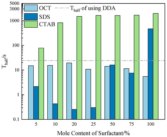 Overall, when the molar content of SDS and OCT in the combined collector is less than 75%, compared to the stability of foam generated by the DDA system, the stability of foam generated by the combined SDS and OCT with DDA can be reduced, while the combination of CTAB and DDA enhances the stability of the generated foam. Additionally, at a concentration of 1 × 10−3 mol/L, CTAB exhibits the highest foam stability, followed by SDS, and OCT has the lowest foam stability. Specifically, the stability of foam generated by CTAB is approximately 100 times that of foam generated by DDA, the stability of foam generated by SDS is approximately 50 times that of foam generated by DDA, and the stability of foam generated by OCT is less than that of foam generated by DDA but within the same order of magnitude.
