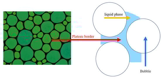 Foam is a dynamic system composed of three structural elements: liquid films, nodes, and Plateau channels, following Plateau’s law. In the equilibrium state, adjacent bubbles in the foam are separated by liquid films, forming a three-forked structure with a 120° angle between the adjacent liquid films, namely the Plateau channels, as shown in Figure 7. The fluid film in the Plateau channel is one basic structural unit of the foam. The liquid film’s thickness directly affects the foam’s drainage and stability. In contrast, the drainage performance of the foam is closely related to the secondary enrichment effect of flotation foam [37].