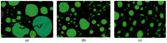 To examine the influence of surfactants on foam structure, at the conditions of collector concentration of 1 × 10−3 mol/L, pH of 10.1, and aeration flow rate of 0.6 L/min with an aeration time of 30 s, the structures of foam generated by a single DDA collector, a combination of OCT/DDA with a 25% mole content of OCT, and a combination of CTAB/DDA with a 20% mole content of CTAB at the 15th second of aeration were recorded. The snapshots of the foam structures are shown in Figure 8.