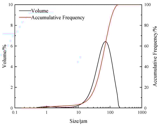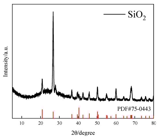 The quartz raw ore used in the experiment was obtained from a mine in Anshan, Liaoning Province, China. The ore samples were crushed, and high-purity, well-crystallized ore blocks were hand-selected. The hand-selected ore blocks were crushed, ground, and sieved to obtain products with a particle size of 15~74 μm. The sieved products were soaked in concentrated hydrochloric acid for 72 h, rinsed multiple times with deionized water, and dried in an oven at a low temperature (105 °C) to obtain samples for flotation experiments. The chemical multi-element analysis results of the flotation test samples are shown in Table 2. The samples were subjected to X-ray diffraction (XRD) analysis using a DISCOVER D8 diffractometer (Bruker, Karlsruhe, Germany), and the spectrum is shown in Figure 9. The particle size of the samples was analyzed using the Masterizer 2000 laser particle size analyzer (Malvern, Malvern, UK), and the analysis results are shown in Figure 10.