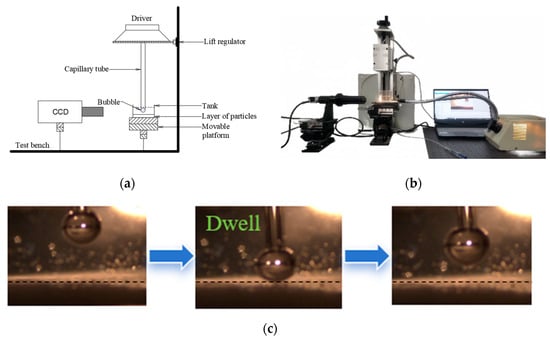 Bubble–particle adhesion induction time testing device and schematic diagram of the testing process. (a) Schematic diagram of device structure; (b) testing device; (c) process of testing bubble–particle adhesion induction time.