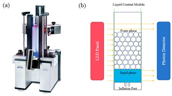 The content of two-phase foam, liquid content in the foam, and foam stability were measured using the model of the DFA-100 dynamic foam analyzer (KRÜSS, Hamburg, Germany). Firstly, 50 mL of solution prepared according to the experimental conditions is added to the observation column. Then, the observation column is placed on the observation platform, and foam is generated using the inflation method controlled by the computer-operated instrument to record experimental data. Each experimental condition is measured five times, and the average of the five measurements is taken as the final result. The main structure of the testing instrument is shown in Figure 13.