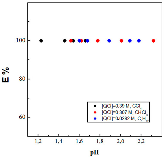 In fact, one ideal representative of ionic liquid compounds is the quaternary ammonium salt, having an industrial nickname of Aliquat 336 (trialkyl(C8–C10)methylammonium chloride, m.p.: −20 °C; viscosity: 1500 mPa·s). Over and above that, it is an intensively investigated molecule from the broad family of IL compounds in academic fundamental research, with essential application for ion-pair complexation in the mining industry for the role of the extractant [19]. Therefore, it is not a surprise that numerous scientific articles dealing with the evaluation of its coordination ability towards f-elements have also appeared [18,30,31]. However, due to its high viscosity, this IL is mostly used as dissolved in organic molecular diluents, as already mentioned. Additionally, it was found that the solvent extraction mechanism is based on anion exchange and hence strongly depends on the composition of the aqueous phase as well [27,32,33]. The extraction behavior of QCl (Q+ is the quaternary ammonium salt cation) towards ReO4− as a function of the pH in the aqueous phase using the studied three organic diluents is shown in Figure 1. In all three investigated solvent systems, the extractability of ReO4− reaches a maximum value in the pH range from 1.2 to 2.3, i.e., 100%. What is good to pay attention to is that a diluent like CCl4 likely prefers a more acidic extraction (aqueous) medium than the other two diluents. Shimojo et al. have recently found that the tripodal ligand N,N,N′,N′, N″,N″-hexa-n-octylnitriltriacetamide, composed of three amide groups and a tertiary amine in isooctane medium, quantitatively extracted TcO4− and ReO4− anions in the pH range from 1.0 to 2.5 [8]. Moreover, it was reported that after five cycles of both forward and back extraction, the ligand retained its high extraction ability for ReO4− in the aqueous phase, and the presence of or increase in NO3− anions in the aqueous phase unfortunately inhibited the ReO4− transfer. The effect of the composition of the organic and aqueous phases on the recovery of rhenium(VII) by triisooctylamine dissolved in 1-octanol or 2-ethyl-1-hexanol was analyzed by Kasilkov and Petrova [34]. Furthermore, the established decrease in DRe on passing from weakly acidic to more concentrated solutions is found to be probably due to a change in the state of the ligand salt in the organic phase under conditions of an increasing concentration of H2SO4 from 0.1 to 9 mol/dm3 in the aqueous phase. The observed effect was accounted for by the competing extraction of the mineral acid by the amine, which hinders the rhenium(VII) solvent extraction. The effect of salt (Na+) or acid anions was investigated by Zhou and co-researchers that indicated a weaker competition of SO42− or Cl− over ReO4− than that of NO3− attributed to the largest ΔGh (standard Gibbs hydration energy) value of NO3− among the three anions [9]. Thus, the inhibition of DRe caused by other competitive anions followed the order as follows: ClO4− > NO3− > SO4− ≈ Cl−. Accordingly, this shows that exactly the chosen chloride anion investigated herein is an ideal candidate and the most suitable for an ion exchange with metal anion species like ReO4−.