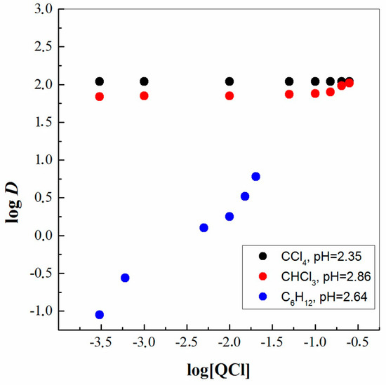 Further, the mechanism of ReO4− solvent extraction with QCl was investigated using the known slope analysis method [27]. In this respect, Figure 2 represents logarithmic plots of the distribution ratio (D) of ReO4− using QCl as a function of the logarithmic extractant concentrations at a constant pH of the aqueous phase in three different organic diluents. It is evident from the obtained results that this liquid compound is quite a strong extractant for metal anions. Therefore, an indisputable advantage is that very small concentrations of the applied extractant QCl completely extract the metal Re(VII) particles from the aqueous to the organic phase. Thus, it is unnecessary for the ligand to be in excess or at a concentration greater than a 1:1 ratio to the metal. Unfortunately, only in a diluent like C6H12 is it possible to report and calculate an approximate slope, i.e., ca. 0.88. Of course, the concentration selected for analysis when using this diluent is also smaller. This result implies that one molecule of QCl ([R3CH3N+][Cl−]) participated in the ReO4− extraction and 1:1 QCl: ReO4− complexes are formed in the organic phase with possible stoichiometry Q+ReO4−. Thus, the reaction mechanism in the organic phase is via ion-exchange mode, and the solvent extraction of metallic anions is much more efficient in solvent systems with chlorine-containing diluents. That is, the whole body of the date obtained, combined with previously published evidence, makes it possible to represent the extraction of Re(VII) with a new formation connected with breaking of the bond between the cation ([R3CH3N+]) and the anion ([Cl−]) of the IL salt.