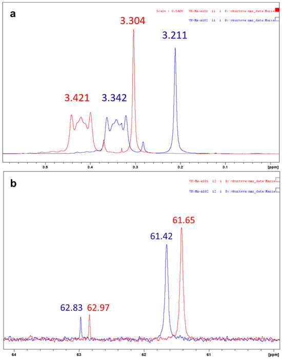 The signals for N-methyl and N-methylene groups in proton (a) and carbon (b) spectra of QCl (blue) and QReO4 (red) in CDCl3.