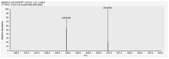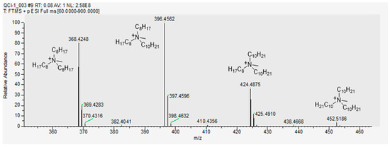 The mass spectra are recorded (Aliquat 336 and organic phase after Re(VII) solvent extraction (1 × 10−2 mol/dm3 Re(VII) and QCl in CHCl3, pHeq = 1.4) using a Q Exactive Plus Hybrid Quadrupole-Orbitrap Mass Spectrometer from Thermo Scientific (HESI HRMS) in both positive and negative modes. The spectra are processed with the Thermo Scientific FreeStyle program version 1.8 SP1 (Thermo Fisher Scientific Inc., Waltham, MA, USA).