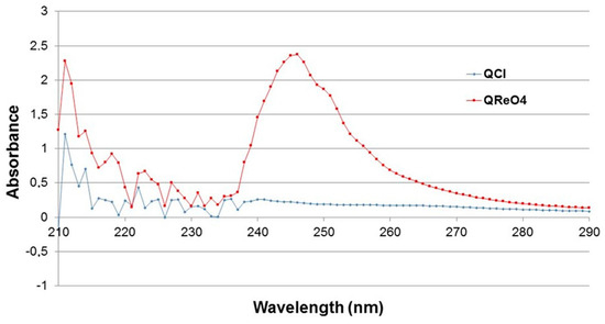 In addition, the UV-Vis absorption spectra of the loaded organic phase (CHCl3) after the solvent extraction process and the organic liquid phase before extraction were both measured as well. The representative peak for the ReO4− anion at wavelength 246 nm [14] was clearly observed (Figure 6), indicating its quantitative transfer from the aqueous phase through an anion exchange mechanism also confirmed by this analysis.