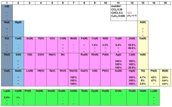 Generally, as already mentioned, rhenium is present in very low concentrations in the Earth’s crust (0.4 mg·t−1) [37]. Additionally, it is produced primarily as a byproduct of molybdenum and copper solvent extraction regardless of the great environmental costs [38]. It is recovered during the pyrometallurgical processing of molybdenum sulfide and copper sulfide ores. This process traditionally involves removing rhenium (VII) oxide, Re2O7, from the sulfurous gas phase generated during hearth roasting (in molybdenum processing) and smelting (in copper processing) [39,40,41]. The low-grade molybdenite concentrate (20–45%) is also associated with approximately 0.01% Re values, in addition to a number of impurity elements such as Si (7.45%), Fe (1.62%), Ni (0.17%) and Cu (0.35%) [42]. Therefore, it would be interesting to study the behavior of more metals during their simultaneous solvent extraction and to compare the obtained results with the target metal, i.e., rhenium. In general, the extraction efficiency diminishes in competitive extraction tests with respect to the single species extraction, which is probably due to a multi-ion competition, or crowding effect or both of them [43]. From the research study aimed at evaluating the solvent extraction ability of the Aliquat 336 molecule towards various metal cations, it can be seen that it is not a suitable extractant for alkali, alkaline earth metals, Cr, Fe, Al or, of course, lanthanoids [27,44], as shown in Figure 7. The lanthanoid solvent extraction with the quaternary ammonium salt Aliquat 336 in perchlorate form alone is negligible under the experimental conditions applied in the previous study by Atanassova as well [27]. Secondly, regardless of the diluent used, ligand concentration or cation charge, complete quantitative extraction was achieved in all three solvent systems for ions such as Re, Hg, Bi and Ag (Figure 7). Unfortunately, when using Aliquat 336, the increases in metal extraction percentages decreased selectivity regardless of the diluent, since the obtained extraction percentages are very close. This indicates a decrease in the separation factors and, consequently, selectivity between target metals. However, for two of the cations in group 12, viz. Zn2+ and Cd2+, changing the diluent leads to a reduction in their extraction process by five times or a lack of it. Moreover, one cannot fail to emphasize the commonly observed better capabilities of the diluent CCl4 in extraction systems compared to CHCl3 [45,46], as seen for metals such as Co2+, Ni2+, Cu2+ and light 4f-ions. Thus, the efficient and selective leaching of specific metals from minerals or wastes is feasible by using the Aliquat 336 compound. In addition, it can be concluded that the proposed solvent extraction system exhibits highly selective extraction for ReO4− in the presence of a large number of diverse ions, as shown in Table 2. The corresponding values of separation factors (SFs) for one solvent system are presented only.