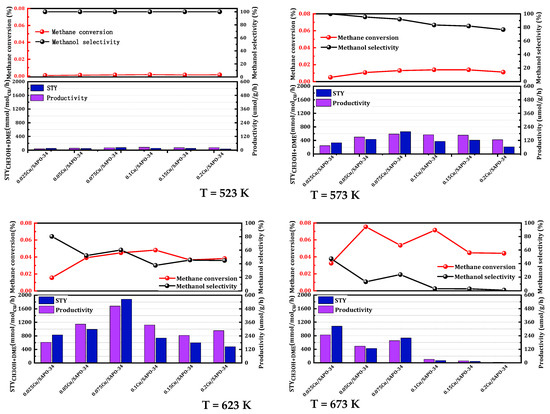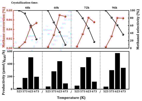 Subsequently, the influence of crystallization time during zeolite synthesis on catalytic activity was investigated. Generally, longer crystallization times in the synthesis process lead to higher catalyst crystallinity, more regular morphology, and fewer defects. To explore the impact of temporal factors during crystallization on catalytic activity, the synthesis time of the catalyst was varied. The results of MtM are depicted in Figure 4. A crystallization time of 72 h demonstrated optimal catalytic performance at a lower temperature of 523 K. At 573 K, the catalyst with a crystallization time of 72 h maintained good catalytic activity (347 μmolCH3OH/gcat/h), with methane conversion reaching 0.03%, corresponding to a methanol selectivity of 79%. However, at relatively higher temperatures in the range of 623 to 673 K, the sample with a crystallization time of 96 h exhibited favorable catalytic effects (572 μmolCH3OH/gcat/h). This suggested that a shorter crystallization time was more favorable for the selective oxidation of methane at relatively low temperatures, while an increase in crystallization time at higher temperatures was beneficial to methane conversion.