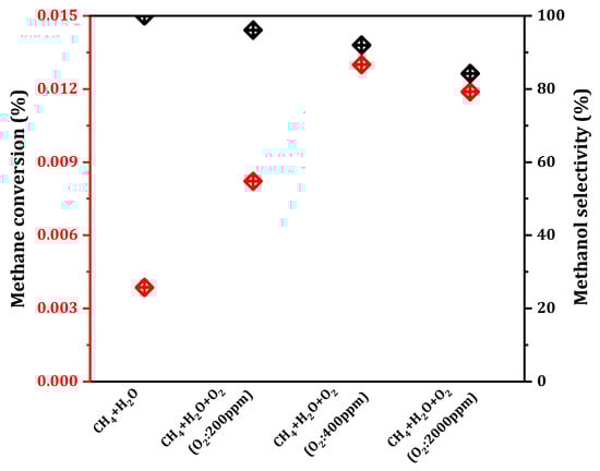 By screening the above preparation conditions, we prepared the 0.075Cu/SAPO-34 catalyst with high MtM activity, and then explored the reaction conditions in order to improve the methanol yield. The role of oxygen in the methane oxidation reaction has been a subject of debate here. While some studies have demonstrated that the oxidation role is primarily played by H2O in the methane oxidation [7], others have argued that O2 also holds significant importance in the oxidation process [22]. In light of this, the impact of O2 on the reaction was investigated by varying the concentration of O2 in the reaction system (from 0 to 2000 ppm). According to the results shown in Figure 5, in a trace amount of oxygen atmosphere (≤400 ppm), the conversion rate of methane increased as the oxygen concentration rose, and the methanol selectivity decreased slightly, but was still above 80%. The highest methane conversion, reaching 0.013%, was achieved at 400 ppm. Higher oxygen concentrations (>400 ppm) led to decreased methanol selectivity, with excessive oxygen resulting in the over-oxidation of methanol to CO2.