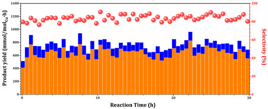 The time-on-stream behaviors of 0.075Cu/SAPO-34 in MtM were further investigated. Experimentally, 0.075Cu/SAPO-34 demonstrated the production of methanol over a 30 h at 573K. The STY averaged 585 mmolCH3OH/molCu/h, with a conversion rate reaching 0.015% and corresponding to a remarkable 93% selectivity (Figure 7). According to previously reported methane conversion outcomes, when the methanol selectivity exceeds 90%, the methane conversion is limited to 0.1% [1]. Compared to the recently reported methanol yield (542 mmolCH3OH/molCu/h) [8], the one-pot Cu-SAPO-34 catalyst demonstrated promising potential and advantages.