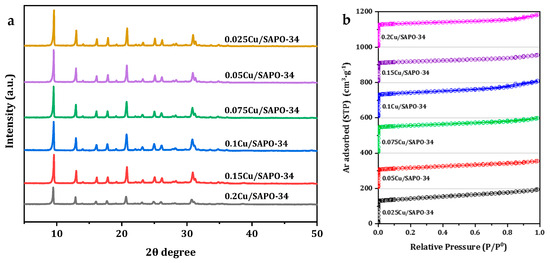 (a) XRD patterns of Cu-SAPO-34 via one-pot method employed; (b) Low-temperature Ar adsorption-desorption isotherms of Cu-SAPO-34 via one-pot method employed.