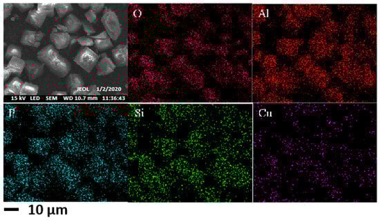 The surface morphology of copper-doped Cu/SAPO-34 catalyst was characterized using scanning electron microscopy (SEM), and the characterization results are shown in Figure 9. It can be directly observed from the figure that Cu/SAPO-34 exhibited a typical CHA cubic block structure, and the distribution of copper on the surface was relatively uniform. The SEM results were in basic agreement with the XRD results, indicating that the synthesized Cu/SAPO-34 was a typical silicon–phosphorus–aluminum zeolite catalyst.