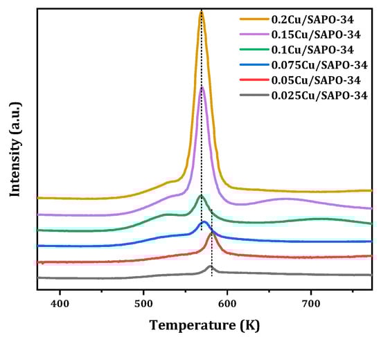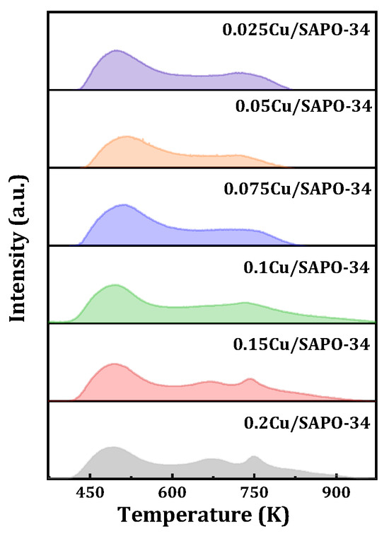 The acidity of the samples was characterized by means of NH3-TPD, and the results are shown in Figure 12. For samples with lower copper content, two NH3 desorption peaks were observed. The low-temperature peak near 500 K is attributed to weak acid adsorption, generally associated with the desorption of physically adsorbed NH3 and NH3 adsorbed on weak Lewis acid sites (surface hydroxyl groups Si-OH, P-OH, Al-OH). The high-temperature peak near 743 K is attributed to strong acid adsorption, typically associated with the desorption of NH3 adsorbed on strong Brønsted acid sites and Lewis acid sites (Si-O(H)-Al and isolated Cu2+ ions). Furthermore, for samples with higher copper content, three NH3 desorption peaks were observed. These peaks were located near 493 K for weak acid desorption, around 670 K for moderate strong acid desorption, generally associated with the desorption of NH3 adsorbed on moderate Brønsted acid sites (Si-O(H)-Al), and near 743 K for moderate strong acid desorption [25]. In summary, it was found that, with the increase of loaded metal content, the strength of moderate strong acid increases while the strength of strong acid decreases. This may be mainly due to the introduction of excess copper in the one-step method, which affected the Cu2+ content and its interaction with the zeolite framework, especially the potential Cu-OH groups or interactions between Cu and acidic centers, and further acidity, leading to significant changes in the acidity environment of the framework.