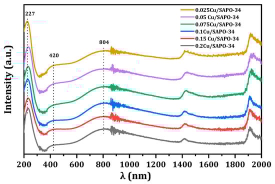 To understand the coordination and dispersion of Cu species in Cu/SAPO-34 catalysts with different copper contents, and to determine the influence of zeolite topology and composition on metal sites, the UV-Visible absorption spectra of the samples were studied. The results, as shown in Figure 13, revealed three main absorption bands for all samples. The UV absorption peak at around 240 nm was attributed to the charge transfer transition from ligands to isolated metal cations (O2−→Cu2+) [26,27,28]. Due to the strong water adsorption capacity of Cu/SAPO-34 zeolites, the UV absorption peak at 420 nm was assigned to hexa-coordinated Cu(H2O)6, Cu-O-Cu, and O-Cu-O species formed by metal and water [29,30,31]. Additionally, the UV absorption at 600–800 nm was attributed to the electron d-d transition of Cu2+ in a distorted octahedral coordination environment surrounded by oxygen [32]. Overall, the spectra indicated that, under these conditions, Cu primarily existed in the form of Cu2+ in the newly prepared catalysts.
