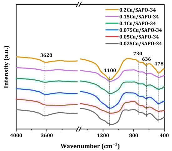 The backbone structure of the synthetic molecular sieve was characterized by FT-IR (Figure 14). In order to determine whether copper was involved in the composition of the skeleton, the Cu/SAPO-34 zeolites were characterized and analyzed infrared. Compared with the infrared spectrum analysis of the SAPO-34 zeolite, the Cu/SAPO-34 zeolite has a similar skeleton vibration absorption band [33]. It follows that the vibration peak near 478 cm−1 belonged to T-O bending vibration of silicon oxygen tetrahedra; the 636 cm−1 peak belonged to the vibration of double six element rings; the peak near 730 cm−1 belonged to O-P-O or O-O-Al-O; peaks near 1100 cm−1 belonged to the asymmetric stretching vibration of O-P-O; and the 3620 cm−1 belonged to the bridge hydroxyl vibration of Al-O(H)-Si. According to the information measured from the skeleton infrared, any absorption corresponding to the vibration of Cu with the oxygen in the framework was not detected. Therefore, the Cu/SAPO-34 zeolite catalysts with different copper loads were not involved in the formation of the skeleton but may fell on the surface or pore of the catalyst.