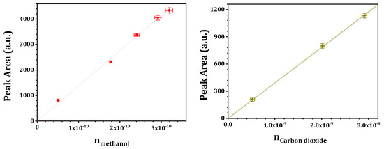 The selective catalytic oxidation of methane was performed on a fixed-bed micro-reactor at ambient pressure. Typically, catalyst sample of 0.1 g (sieve fraction 250–400 μm) was placed in the quartz reactor and the reactant gas mixture containing methane, water and dioxygen was fed to the quartz reactor at designated temperature. The total flow rate was controlled at 60 mL/min, corresponding to a gas hourly space velocity (GHSV) of 30,000/h. The reaction outlet was on-line analyzed by a gas chromatograph (SHIMADZU GC-2014, Kyoto City, Japan) equipped with a thermal conductivity detector (TCD, with one MS-13X packed column and two Porapak N packed columns) and a flame ionization detector (FID, with one Plot Q capillary column). Methane, carbon monoxide, carbon dioxide and dihydrogen were analyzed by TCD, while methane, C1 oxygenates and C2+ hydrocarbons were analyzed by FID (argon as an internal standard, methane as a link between TCD and FID). The concentration of methanol (also for carbon monoxide, carbon dioxide, etc.) was quantitatively determined by external standard method (see Figure 16 for typical calibration curves) and the yield of methanol () was obtained via volume conversion. The methanol selectivity was determined by normalization: , (byproducts below the detect limitation of gas chromatograph were ignored and the possible coke deposition was fully excluded even after long-term running). The conversion of methane was calculated as: .