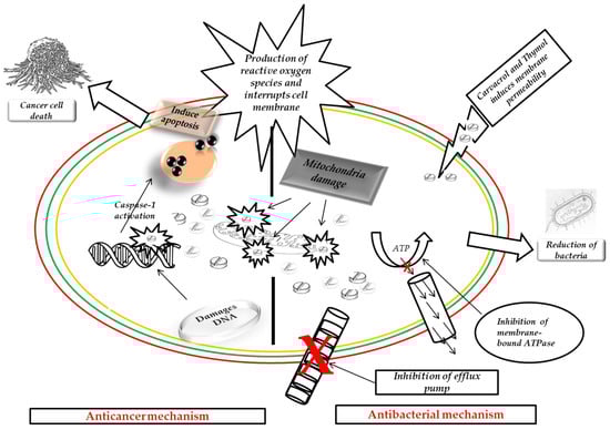 Carvacrol and thymol’s anticancer and antibacterial mechanisms of action.