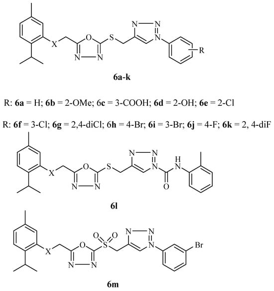 Almalki et al. synthesized thymol hybrid compounds after they displayed good druglikeness and pharmacokinetics properties in silico [48]. The synthesized hybrids 6a–m (Figure 7) displayed significant antiproliferative results when compared to the reference drugs (doxorubicin (IC50 = 1.2 µM) and 5-fluorouracil (IC50 = 18.74 µM)) with no obvious trends when evaluated against HCT-116, MCF-7, and HepG2 cancer cell lines. The hybrids displayed selective anticancer effects on the cancer cell lines, with compounds 6b–f being the most potent compounds against MCF-7 with IC50 values in the range of 1.1–4.9 µM. Hybrids 6b and 6d inhibited the growth of HepG2 cell lines with IC50 values of 1.8 µM and 1.4 µM, respectively. Against HCT-116 cell lines, only compound 6d showed promising results with an IC50 value of 2.6 µM. These antiproliferative results were comparable to those of doxorubicin but were 15–20-fold more active than 5-fluorouracil [48]. The SAR of these hybrids revealed that the number and position of substituents influenced the anticancer effect [48]. The biological activity of the hybrids was not enhanced for the meta- and para-substituted hybrids when compared to the ortho-substituted hybrids with improved cytotoxicity. Increasing the number of substituents reduced their cytotoxic effects when compared to the monosubstituted hybrids. The introduction of a sulfone group also reduced the cytotoxic effect of the hybrids [48].