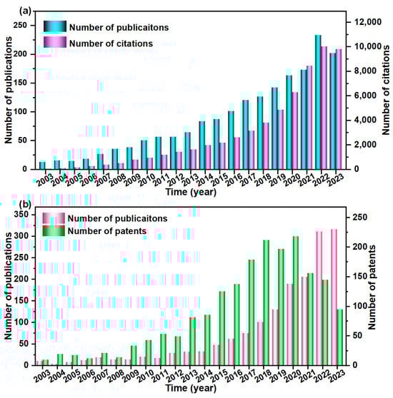 (a) The count of search results of publication and citations related to ‘ceramic micro-nanofibers’ on Web of Science from year 2003 to 2023. (b) The count of search results of publication and patents related to ‘ceramic fiber’ and ‘thermal insulation’ on web of science and incoPat from year 2003 to 2023.