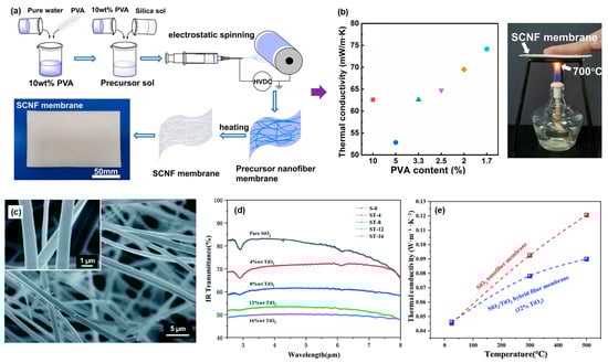 (a) Schematic depicting the fabrication procedure for SiO2 nanofibrous membranes. (b) Variation in thermal conductivity among SiO2 nanofibrous membranes prepared using different precursor sols and emphasizing the excellent thermal insulation properties exhibited by SiO2 fiber membranes. (c) SEM images of SiO2/TiO2 fiber membrane at 900 °C. (d) Infrared transmittance spectra of specimens with varying TiO2 contents. (e) Thermal conductivity profiles of the dual fiber membranes at different temperature intervals. (a,b) Reproduced with permission [11]. Copyright 2022, Springer. (c–e) Reproduced with permission [66]. Copyright 2021, RSC.