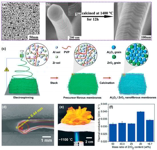 (a) TEM image of the sol particles (black dots) in the electrospinning precursor. (b) SEM images of α-Al2O3 nanofibers before and after calcining at 1400 °C for 12 h, demonstrating their extraordinary thermal stability. (c) Schematic depicting the preparation procedure of Al2O3/ZrO2 nanofibrous membranes. (d) SEM images of Al2O3/ZrO2 membrane bending and folding at the microscale. (e) Illustration of the outstanding thermal insulation performance of the Al2O3/ZrO2 fibrous membrane. (f) Thermal conductivity of Al2O3/ZrO2 nanofibrous membranes. (a,b) Reproduced with permission [12]. Copyright 2012, WILEY-VCH. (c–f) Reproduced with permission [70]. Copyright 2022, RSC.