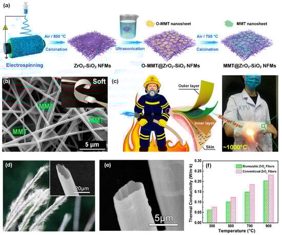 Mao and co-workers [73] utilize electrospinning to fabricate flexible yttrium-stabilized zirconia (YSZ) nanofibers and achieved a transition from brittle to flexible to brittle by controlling the yttrium content in the fibers. The brittle-to-flexible-to-brittle transition of YSZ membranes is studied with regard to the influences of crystalline phase, grain size, and pore width. They found that the optimal grain size for the YSZ nanofibrous membranes is 23.8 nm. Moreover, to further enhance the mechanical and insulation properties of ZrO2-SiO2 nanofibers, they incorporate the ultrathin montmorillonite (MMT) nanosheets into ZrO2-SiO2 fiber substrate and establishing interfaces with fibers (Figure 6a). The synthesized MMT@ZrO2-SiO2 membranes exhibited favorable softness, tension strength of 1.83 MPa, exceptional fire resistance, and remarkable thermal insulation capabilities (~0.026 W·m−1·K−1 at room temperature), as demonstrated in Figure 6b,c. Subsequently, following a direct polymer template-regulated sol-gel electrospinning process and follow-up calcination, a range of yttria-doped zirconia (YDZ) nanofibrous membranes were successfully fabricated, demonstrating flexibility, foldability, and exceptional thermal stability [74]. The study illustrated the controllability of fibrous dimensions, grain morphology, mechanical characteristics, and thermal resistance of YDZ fibrous membranes through manipulation of polymer template composition and molecular weight. The resultant YDZ fibrous membranes demonstrate extraordinary performance, including outstanding tensile strength of approximately 4.82 MPa, excellent thermal durability up to a temperature of 1200 °C, low thermal conductivity ranging from 0.008 to 0.023 W·m−1·K−1 across the temperature range of 25 to 1000 °C, and outstanding fire resistance.