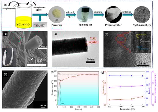 (a) Scheme illustrating the preparation of Y2O3 nanofibers. (b) SEM images of Y2O3 nanofibers treated at 800 °C for 2 h (the inset is the fiber cross section and optical photo). (c,d) TEM images of Y2O3 nanofibers heat treated at 800 °C. (e) SEM image of YAG fiber after heat treatment at 1200 °C. (f) Relationship between temperature change of cold surface and time under a butane torch. (g) The thermal conductivity, density, and porosity of YAG fiber membranes calcinated at different temperature. (a–d) Reproduced with permission [14]. Copyright 2018, Elsevier. (e–g) Reproduced with permission [77]. Copyright 2021, Elsevier.