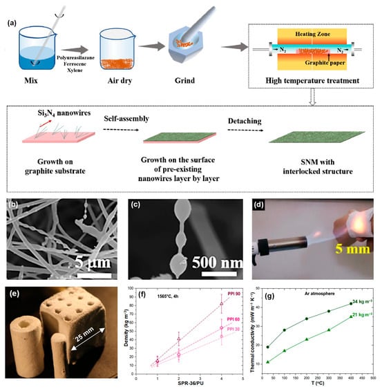 (a) Scheme illustrating the synthesis of Si3N4 nanowire membrane. (b,c) SEM images of the Si3N4 nanowires at different magnifications after heat treatment at 1300 °C. (d) Demonstration of fireproof and thermal insulation performance of Si3N4 nanowire membrane. (e) Si3N4 nanofelts with complex shapes. (f) The impact of relevant experimental parameters on the density of Si3N4 nanofelts. (g) Thermal conductivity of Si3N4 nanofelts. (a–d) Reproduced with permission [18]. Copyright 2020, Elsevier. (e–g) Reproduced with permission [87]. Copyright 2023, Elsevier.