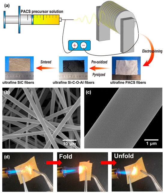 (a) Diagrammatic drawing of the SiC fiber membrane. (b,c) SEM images of the resulting SiC fibers at different magnifications. (d) Flexible demonstration of SiC fibers in a blowtorch flame at 1100 °C. (a–d) Reproduced with permission [96]. Copyright 2022, Elsevier.