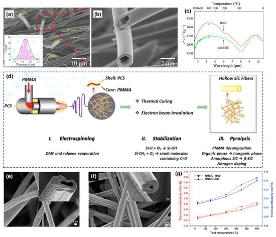 To enhance the thermal insulation performance of SiC fibers, Tian et al. [26] developed hollow-structured SiC ultrafine fibers using the emulsion electrospinning technique, followed by pre-oxidation and pyrolysis treatment. The resulting SiC fibers were consistently hollow with a narrow diameter distribution ranging from 1.2 to 2.5 μm and a wall thickness measuring 250 nm (Figure 10a,b). The extinction coefficient of hollow SiC fibers in the infrared region of 2.5 to 6 μm increases by approximately 30% when compared to the solid SiC fiber mat (Figure 10c). At a temperature of 800 °C, the thermal conductivity of hollow SiC fiber measures 0.1049 W·m−1·K−1, signifying a considerable reduction compared to that of solid SiC fiber, which registers at 0.3631 W·m−1·K−1. This indicates the crucial role of the hollow structures in improving the fibers’ thermal insulation performance. In contrast, Liu et al. [97] utilized the co-axial electrospinning technique to create N-doped hollow SiC fibrous mats, as demonstrated in Figure 10d. The shell layer was composed of PCS solution while the core layer consisted of poly(methyl methacrylate) (PMMA) solution. To preserve the fiber morphologies during the pyrolysis process, the precursor fibers were crosslinked through thermal oxidation in an atmospheric environment of air. Afterward, the crosslinked fibers underwent pyrolysis at varying temperatures in a N2 atmosphere to prepare N-doped hollow SiC fibers (Figure 10e). Alternatively, the as-spun core–shell fibrous mats fibers were cured through electron beam irradiation (EBI) (Figure 10f). The introduction of nitrogen doping led to a noteworthy reduction in thermal conductivity for the hollow SiC fibers, with the N-doped variant exhibiting a value of 0.026 ± 0.013 W·m−1·K−1 at 25 °C, as compared to the 0.138 W·m−1·K−1 observed for the undoped fibers at the same temperature (Figure 10g). This observation underscores the significant impact of nitrogen doping on enhancing thermal insulation properties.