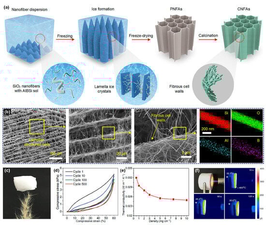 - Zhang, X.; Liu, C.; Zhang, X.; Si, Y.; Yu, J.; Ding, B. Super strong, shear resistant, and highly elastic lamellar structured ceramic nanofibrous aerogels for thermal insulation. J. Mater. Chem. A 2021, 9, 27415–27423. [Google Scholar] [CrossRef]