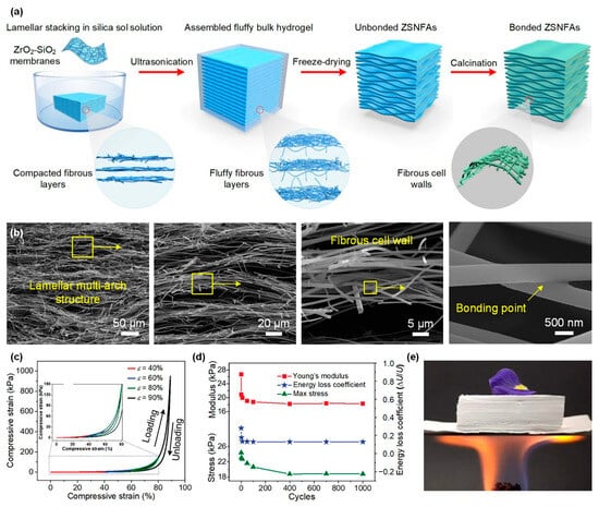 - Zhang, X.; Wang, F.; Dou, L.; Cheng, X.; Si, Y.; Yu, J.; Ding, B. Ultrastrong, superelastic, and lamellar multiarch structured ZrO2–Al2O3 nanofibrous aerogels with high-temperature resistance over 1300 °C. ACS Nano 2020, 14, 15616–15625. [Google Scholar] [CrossRef]