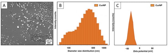 (A) SEM image demonstrates somewhat spherical CurNPs with some agglomeration. (B) DLS histogram demonstrates the hydrodynamic diameter (size) distribution of CurNPs, with notable polydispersity due to the agglomeration of primary particles. (C) Zeta potential charge distribution of CurNPs in an aqueous solution.