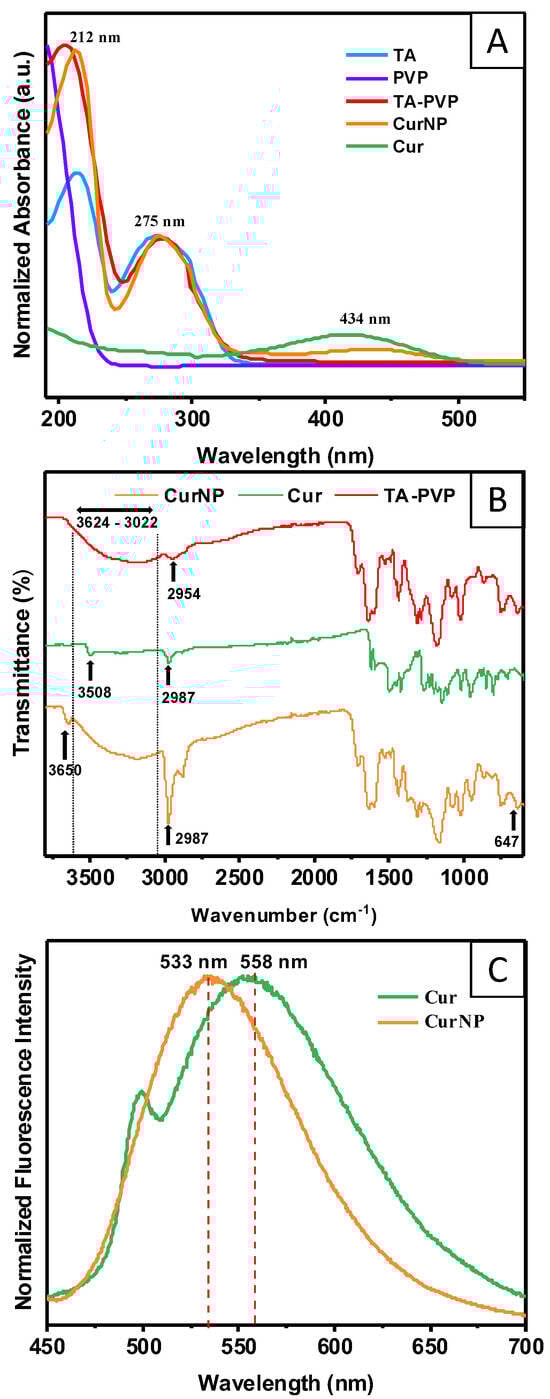 (A) UV–Visible spectra of curcumin, CurNP, and TA–PVP to confirm the presence of components within the NP system. (B) FTIR spectra of curcumin, CurNP, and TA–PVP to confirm the presence and interactions of components within the NP system. (C) Fluorescence emission spectra of CurNP and curcumin in an aqueous solution to determine localization of curcumin within the NP.