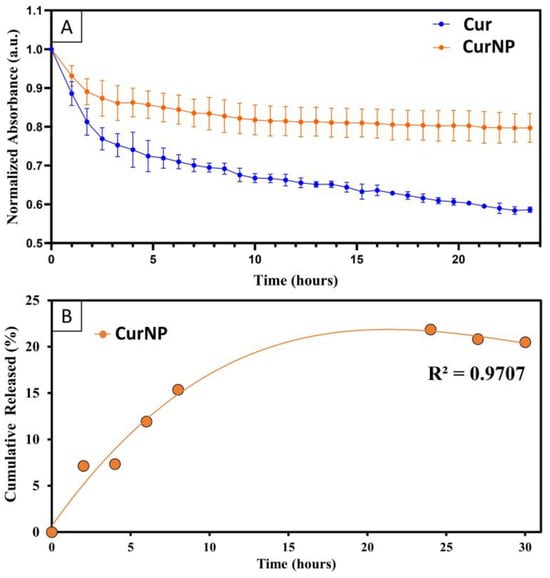 (A) Degradation rate measured through the absorbance of curcumin and CurNPs in PBS at 425 nm for 24 h. Statistical analysis was performed using simple liner regression (p < 0.0001). (B) Cumulative release of curcumin from CurNPs dispersed in water, measured up to 30 h.