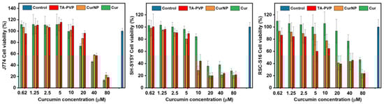 The viability of these cell lines when treated with CurNPs was measured using an alamarBlue assay. In this assay, metabolically active cells convert resazurin to resorufin whereby the latter can be detected via fluorescence at 590 nm [47]. In the case of TA–PVP-only conditions, the concentration range for these components was identical to the TA–PVP concentrations applied for CurNPs. Figure 4 demonstrates that the viability of SH-SY5Y cells remains relatively uncompromised when treated with TA–PVP or CurNP up to concentrations corresponding to 5 μM of curcumin, beyond which cytotoxicity becomes evident. Further, cell viability is significantly reduced by CurNPs at 10 μM, likely because both curcumin and TA were reported to be anti-cancer agents, and SH-SY5Y is a neuroblastoma cell line; this points to the importance of careful selection in cell lines to ensure compatibility with the therapeutic being tested. Future studies could consider the use of other immortalized neuronal cell lines such as 50B11, or even primary cells such as Dorsal Root Ganglions, as models instead [48]. Figure 4 also demonstrates that the CurNPs are biocompatible on J774A.1 and RSC-S16 cells up to concentrations corresponding to 10 μM and 5 μM of curcumin, respectively. These results provide evidence for the biocompatibility of the CurNP system on relevant cell lines. Additionally, they provided a reference for treatment concentrations to assess the in vitro delivery of curcumin into each cell type via confocal fluorescence microscopy.