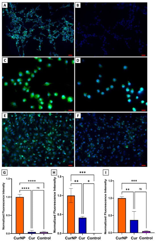 Confocal fluorescence microscopy images of (A) SH-SY5Y, (C) J774A.1, and (E) RSC-S16 upon treatment with CurNPs for 24 h (green channel). Images (B) SH-SY5Y, (D) J774A.1, and (F) RSC-S16 correspond to cells treated with free curcumin for 24 h. (G–I) Quantitative analysis of green fluorescence intensity in for SH-SY5Y, J774A.1, RSC-S16 cells, respectively (normalized). The red scale bar represents 20 µm. The bar graphs represent the mean and error bars correspond to the standard deviation (n = 3). Statistical analysis was performed using one-way ANOVA (* p < 0.05, ** p < 0.01, *** p < 0.001, **** p < 0.0001, ns not significant).