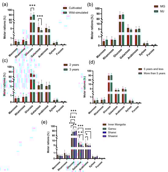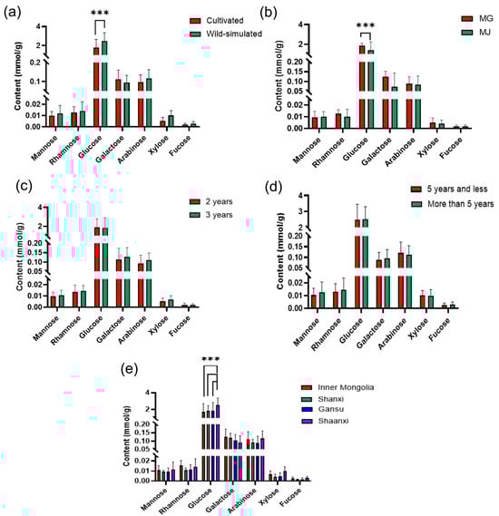 Comparison of the molar amounts of monosaccharides in APSs of RA from (a) different growth patterns, (b) different species (MG (Astragalus membranaceus. var. mongholicus) and MJ (Astragalus membranaceus)), different growth years of (c) cultivate RA aged 2 and 3 years and (d) wild-simulated divided by 5 years, (e) different origins ( *** p < 0.001).