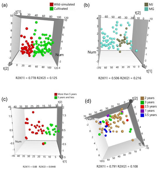PCA analysis of RA samples from (a) different growth patterns, (b) different species, different growth years of (c) wild-simulated and (d) cultivate.