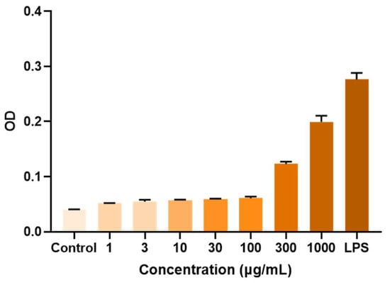 A 100 μL suspension of RAW 264.7 cells were plated at 1 × 106 cells/mL in 96-well plates and incubated for 24 h. After removing the medium, macrophages were firstly stimulated with different concentrations of APSs (1, 3, 10, 30, 100, 300, 1000 μg/mL) for 24 h to determine the proper concentration. In subsequent experiments, the macrophages were incubated with 300 μg/mL APS, 1 μg/mL LPS (as the positive group), or DMEM (as the control group). After 24 h, 50 μL of the supernatants were collected and reacted with Griess reagent at room temperature for 10 min. Nitrite products were determined by measuring absorbance at 540 nm with a microplate reader, and the average absorbance value of the 3 replicates was taken.