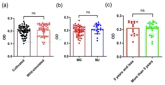 Effect of APSs from (a) different growth patterns, (b) different species and (c) different growth years of wild-simulated on the release of NO by macrophages, “ns” means “not significant”.
