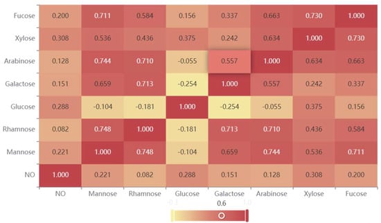 When stimulated by external stimuli, stress cells such as macrophages release Nitric Oxide (NO), which serves as a signaling molecule involved in signal transduction in the body and plays a role in killing or inhibiting pathogen reproduction in the immune system [29]. At mass concentrations of 30, 100, 300, 1000 μg/mL of APSs, or 1 ug/mL of LPS that were treated on macrophages RAW264.7 for 24 h, the NO production released by macrophages was significantly higher than that of the normal control group. APSs could stimulate the NO production in a dose-dependent manner. The higher the concentration of APS, the greater the NO production (Figure 6). As shown in Figure 7, there was no significant difference in the effect of RA from different sources on NO release, although they were clearly separated in the PCA model. In addition, the Spearman correlation analysis results were shown in Figure 8, indicating a significant correlation with Man, Glu, Xyl, and Fuc. Therefore, it can be speculated that the release of NO by macrophages was the result of the joint influence of multiple monosaccharides.