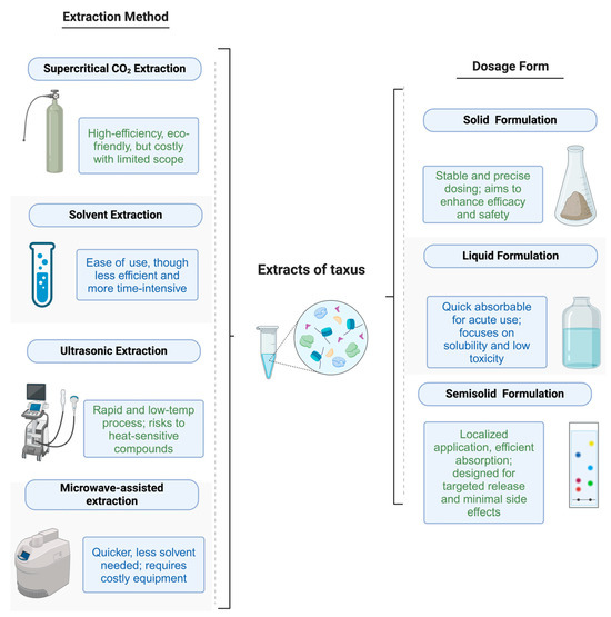 Due to their significant pharmacological actions, the bioactive compounds in Taxus have become a valuable resource in modern drug development. With the continuous progress of medical science, effectively extracting and utilizing the medicinal components of Taxus and developing them into appropriate pharmaceutical dosage forms have become an important research hotspot in the scientific field. In our discussion on the development of various extraction methods and formulation techniques for Taxus, we have summarized the most critical methods and their applicability in Figure 1. This figure illustrates the various technologies and approaches utilized in the preparation and formulation of Taxus extracts, highlighting the connections between different extraction methods and their impact on formulation effectiveness and efficiency.