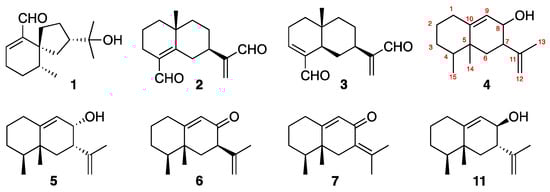 - Nagashima, F.; Ishimaru, A.; Asakawa, Y. Sesquiterpenoids from the Liverwort Marsupella aquatzaca. Phytochemistry 1994, 37, 777–779. [Google Scholar] [CrossRef]