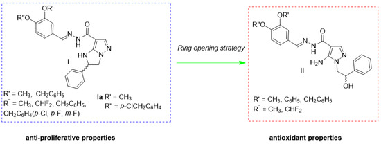 In the effort to synthetize new pyrazole-based compounds able to interfere with inflammation, oxidative stress, and tumorigenesis, we recently reported derivatives I (Figure 1) endowed with excellent anti-proliferative activity. Molecular docking and molecular dynamic simulations suggested the ability of the most active compound Ia (Figure 1) to interact with polymeric tubulin α/tubulin β/stathmin4 complex at the colchicine binding site [34]. By applying a ring opening strategy, we obtained 5APs II (Figure 1), able to strongly inhibit ROS and superoxide anion production, lipid peroxidation, and NADPH oxidase in thrombin-stimulated human platelets and ROS formation in EAhy926 cells [35].