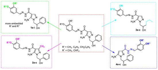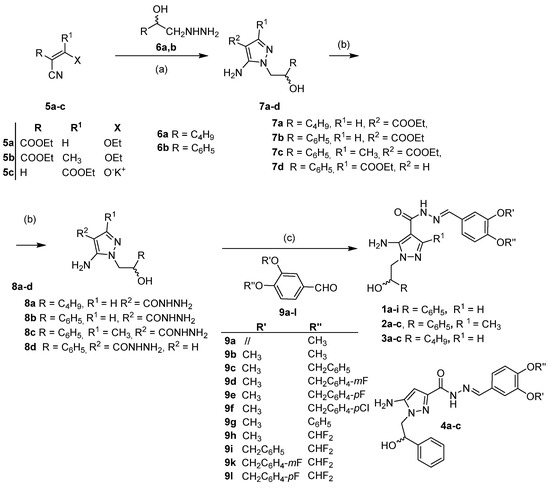 5APs 1–4 were synthesized in good-to-moderate yields through the three-step sequential procedure (Scheme 1). Briefly, the condensation of the proper ethyl cyanoacrylate 5a–c with suitable hydrazinoethanol 6a,b [36,37,38] led to 5APs 7a–d, as previously reported [37,38,39]. These intermediates were then transformed in the corresponding hydrazides 8a–d by reaction with hydrazine monohydrate. Finally, the reaction between carbohydrazide intermediates 8 and the suitable benzaldehydes 9a–l (commercially available or prepared via literature methods [40,41]) allowed the isolation of the desired compounds 1–4 (Table 1).