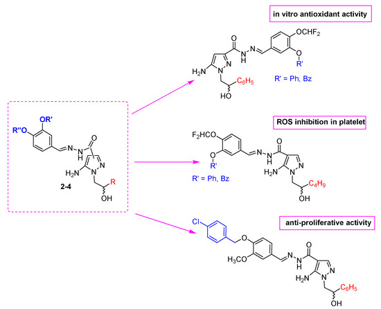 - Finally, compounds 2, bearing an additional methyl group on C3 position of pyrazole nucleus, did not show a relevant biological activity, confirming that the increase of steric hindrance in this position is detrimental not only for antioxidant activity and ROS production inhibition in platelets but also for anti-proliferative activity.