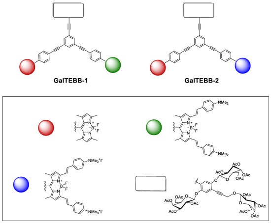 In continuing our research on biocompatible glycoconjugates [13] and particularly multichromophoric systems in which differently substituted BODIPY moieties, chosen to function as artificial antenna systems with extremely efficient and fast coulombic energy transfer, were linked to more than one sugar skeleton, in this paper, we describe the synthetic procedure of luminescent galactoconjugates GalTEBB-1 and GalTEBB-2 (Figure 1), where two BODIPY moieties and three galactoside rings are mounted onto an oligophenylenethynylene (OPE) skeletal support [14].